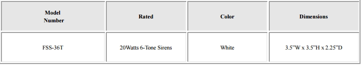 - Rated at 20 watts 6-Tone Sirens - 6-DIP switch - Wall –mounted flat Siren - Patented design - Architectural white - Dimensions: 3.5”W x 3.5”H x 2.25”D Specifications_PDF