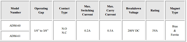 - 1/4” to 3/4” operating gap - 2 reed switches - Magnet type: 3 pcs ferrite, 2 pcs bias - 24” leads AWG #22 Specifications_PDF