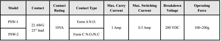 - 25” Leasds AWG #22 - 3 mm pre-travel stroke - 7 mm overall operating stroke - (2) Reed switches in one housing (PSW-2 only) - PSW-1: Ivory color - PSW-2: Brown, Gray or Ivory colors Specifications_PDF