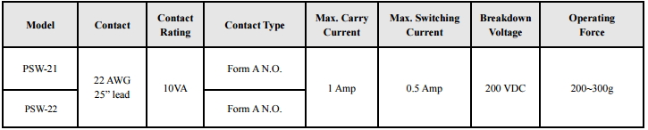 - 3/8” Press fit Plunger Switches - 25” leads AWG #22 - 3 mm pre-travel stroke - 7 mm overall operating stroke - PSW-21: Brown, Gray or Ivory colors - PSW-22: Ivory color Specifications_PDF