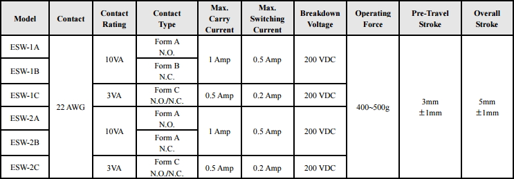 - Protective boot, AWG #22 - Normal length: ESW-1(11”), ESW-2(36”) - A type: N/O SPST/push button to close - B type: N/C SPST/push button to open - C type: N/C N/O SPDT transfer contacts - Color: Brown, Gray or Ivory Specifications_PDF